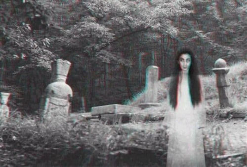 Description : photographie prise dans une forêt d'un jeune homme, derrière l'épaule duquel se trouve le spectre d'une jeune femme en robe blanche.