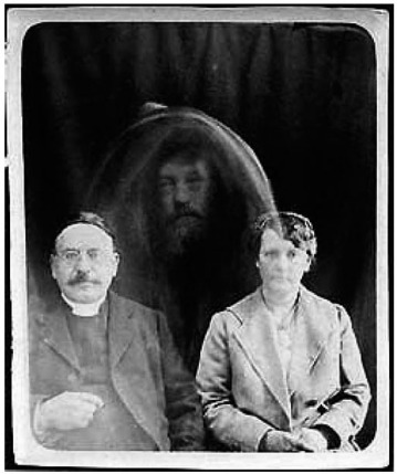 Photographie prise par William Hope le 5 septembre 1919 (3 × 3,5 pouces), où l’on voit le révérend Charles L. Tweedale avec son épouse. L’esprit, ou « extra », est feu F. Burnett (© The American Photography Museum, 2000, site :