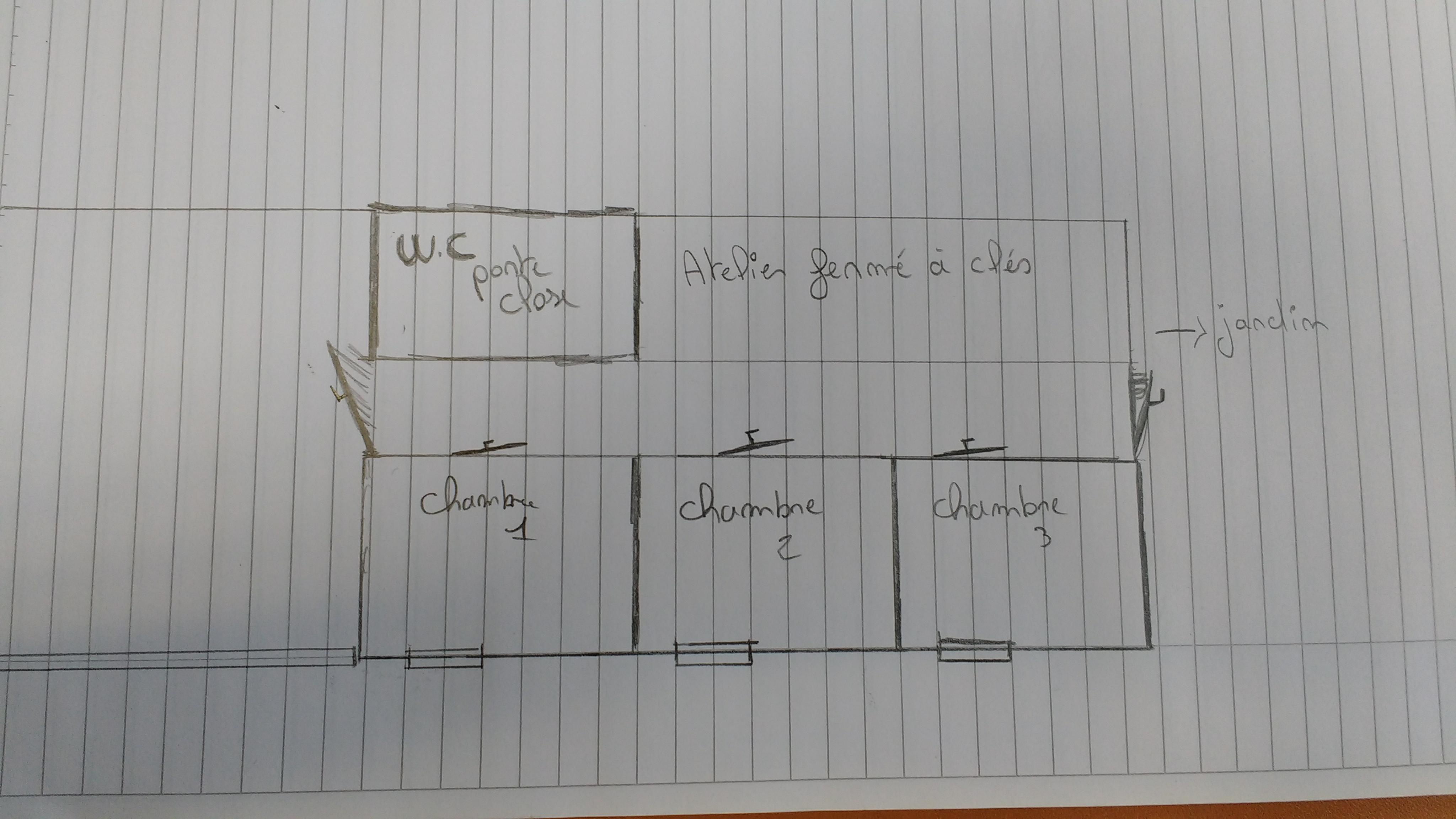 Donc dans le couloir , en haut on avais des WC/Salle de Bain (Porte fermée au moment des faits) à droite de cette dernière un atelier (d'après ce que nous avais dit le locataire) fermé à clés