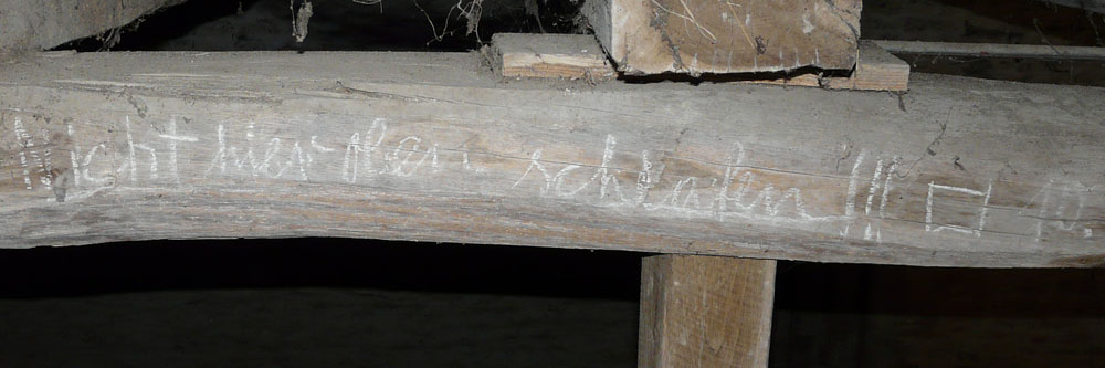 Or, sur une des poutres du plafond, mon pote et moi avons découvert une inscriptions manuscrite à la craie, qui après examen s'est révélée être en allemand. J'ai quelques bases, j'ai pu déchiffrer quelques mots, mais bon l'inscription entière est difficilement déchiffrable. Voici deux photos que nous avons prises :