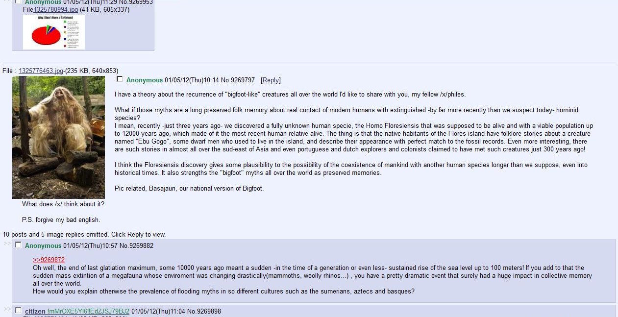 Bon, la source originale n'est pas connue pour être fiable, même les usagers de /x/ ne sont pas dupes quant au grand foutoir du sens que c'est. cependant, je trouve le site intéressant à de nombreux égards: c'est un espace de débats (pas toujours constructifs), et il permet parfois des ouvertures vers des sujets peu ou pas abordés, ou de défricher et de cataloguer les hoaxes et les creepypastas en tout genre. Pour peu qu'on y regarde avec un oeil un peu distancié et averti (et qu'on évite /random/) on peut parfois y trouver son bonheur :)