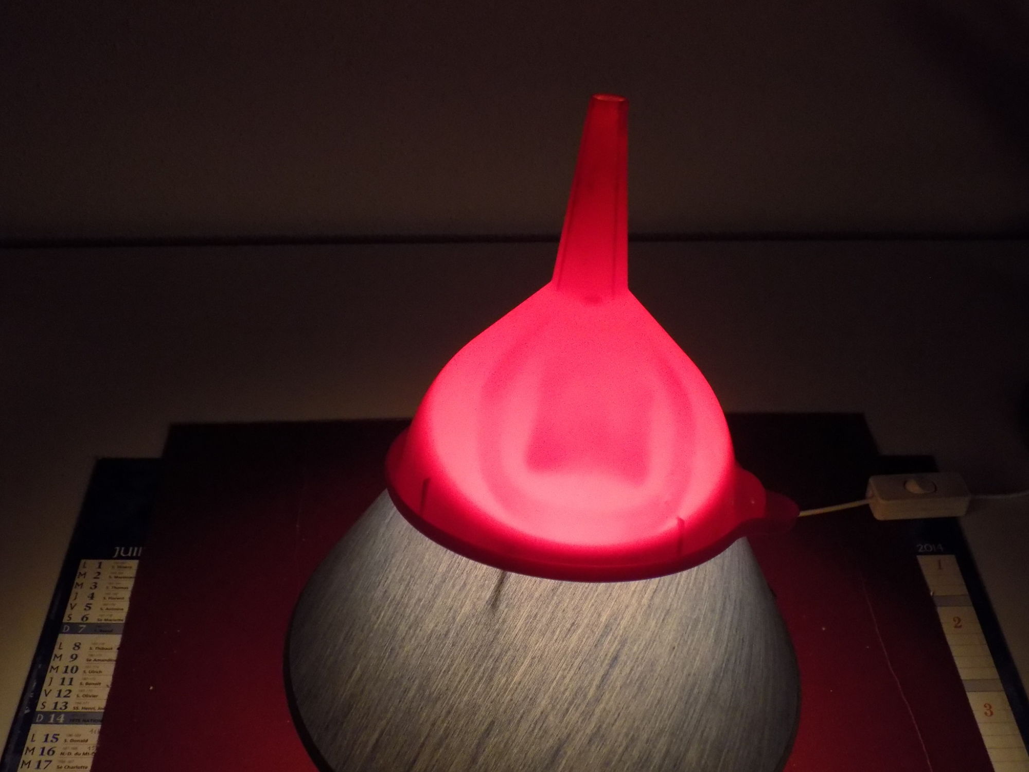 b) J'ai également l'habitude d'utiliser, une fois par semaine, un entonnoir en plastique rouge, et un beau jour je constate qu'un cercle est apparu sur la face externe de la partie évasée, alors qu'un carré s'est formé sur la face interne. Pour visualiser ces deux formes simultanément, j'ai posé l'entonnoir sur une lampe de chevet. J'ai allumé la lampe, et j'ai pris la photo dans l'obscurité, après avoir posé la lampe sur une surface sombre pour éviter les reflets parasites. Comme vous pourrez le constater en suivant le lien ci-dessous, le centre du carré coïncide parfaitement avec le centre du cercle. Cette fois-ci, j'ai compris le message correspondant qui concerne ma vie privée.